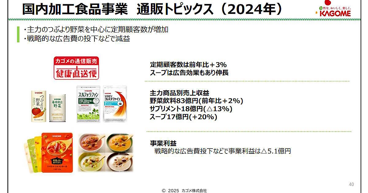 カゴメの2024年通販売上は133億円で1.8%増、事業利益は68.1%減 -