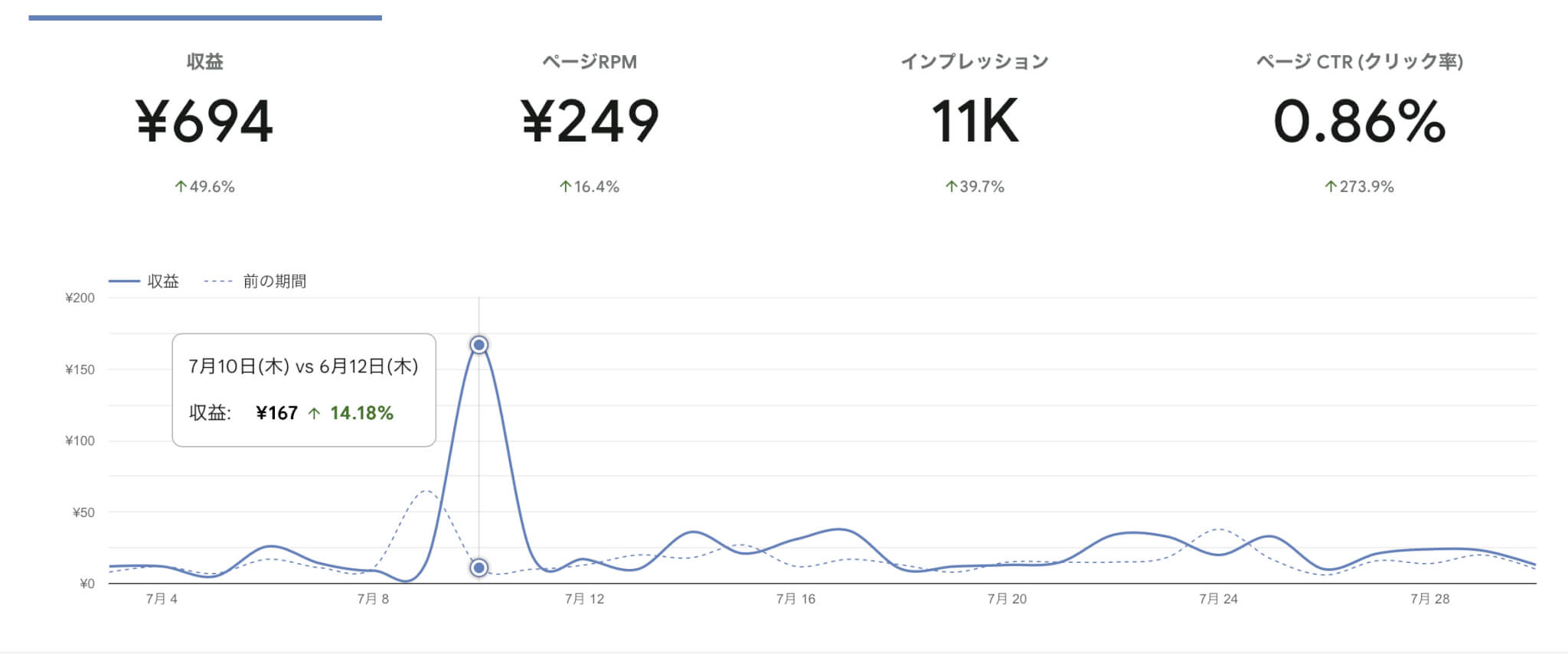 7月10日が1番の“跳ね日”で、1日で167円の収益が発生。月収益の約24%がこの日に集中してました。