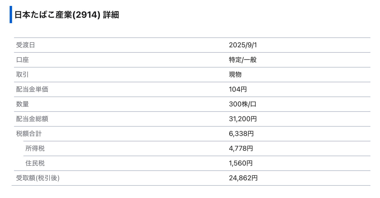 2025年9月1日、日本たばこ産業(JT、証券コード:2914)から配当金31,200円(税引後24,862円)を受け取りました。