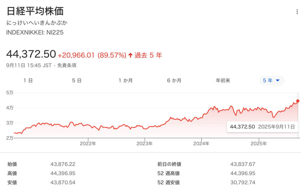 2025年9月11日、日経平均株価は終値で 44,372.50円(前日比 +534.83円、+1.22%)を記録し、過去最高値を更新した。取引終了時点でのこの水準は、株式市場の強気ムードを明確に示している。