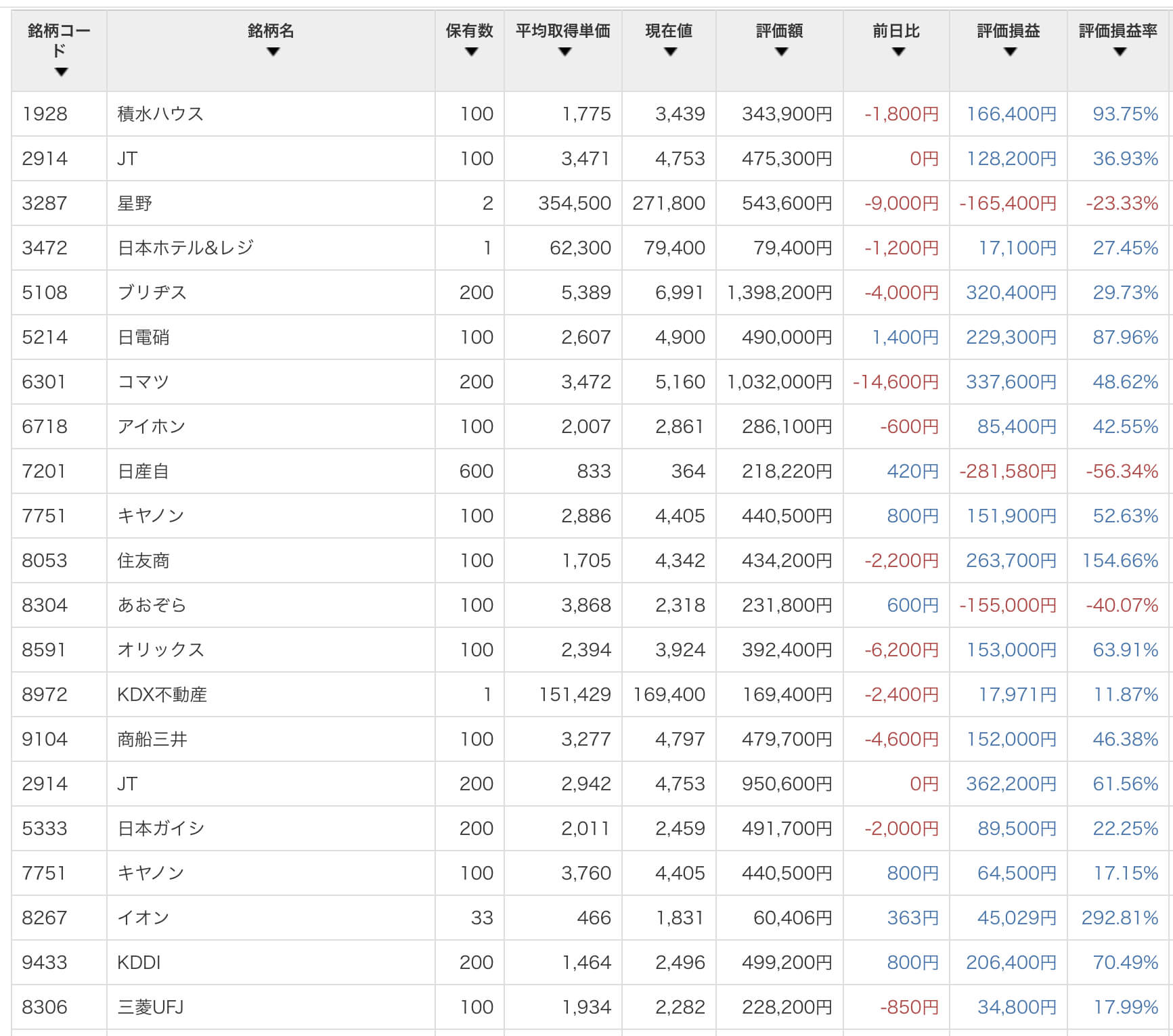私の保有銘柄の前日比