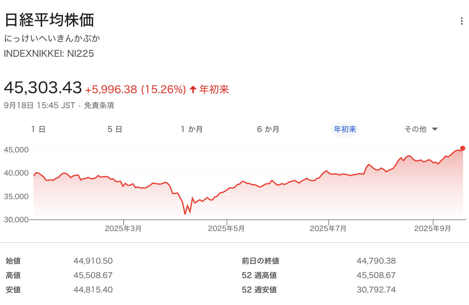 きょうの東京株式市場では、日経平均が年初来の高値を更新し、45,000円台を回復しました。
