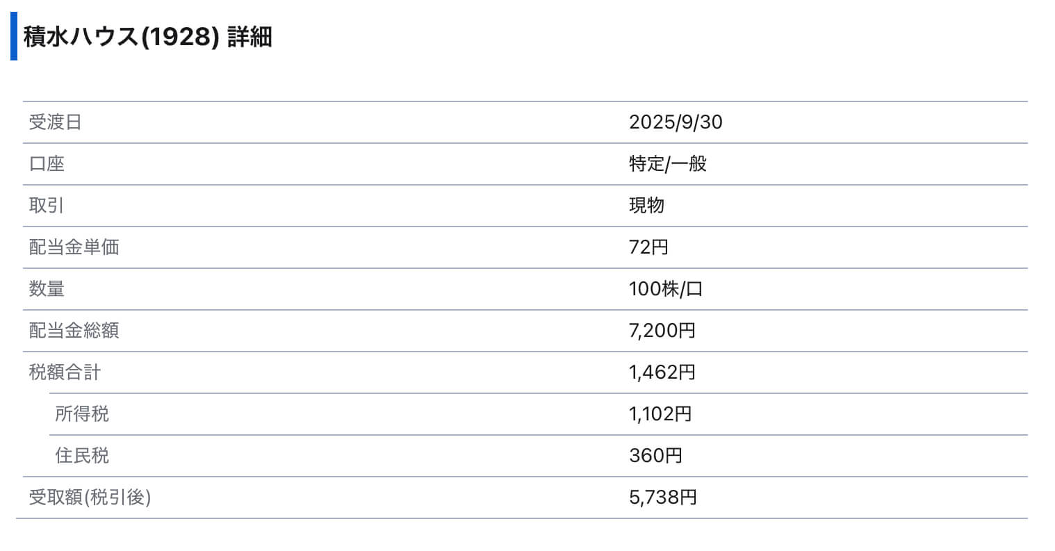 9月末、住宅メーカー大手の 積水ハウス(1928) から配当金が入金されました。