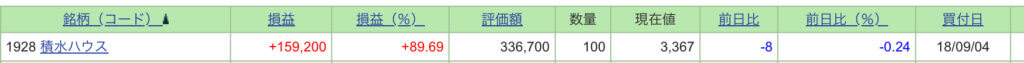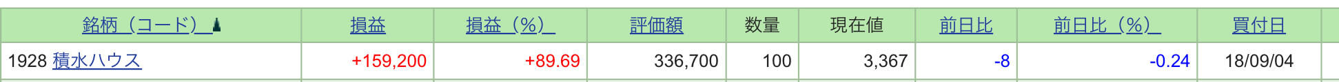 今月は他にも複数の銘柄から配当が入っていますが、その中でも安定感と高利回りを両立している積水ハウスは、長期保有の主力銘柄です。