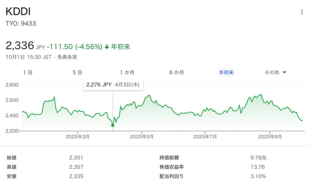 最近、私の保有銘柄である KDDI(9433) の株価が大きく下落しました。
