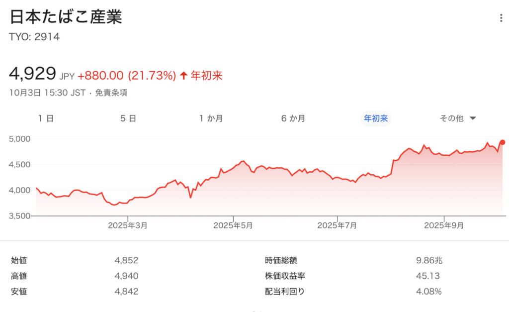 本日(2025年10月3日・金曜)、JT株は前日比+3.62%高の4,929円で取引終了しました。年初来高値の4,940円を一時更新し、取引終盤まで高値圏を維持。