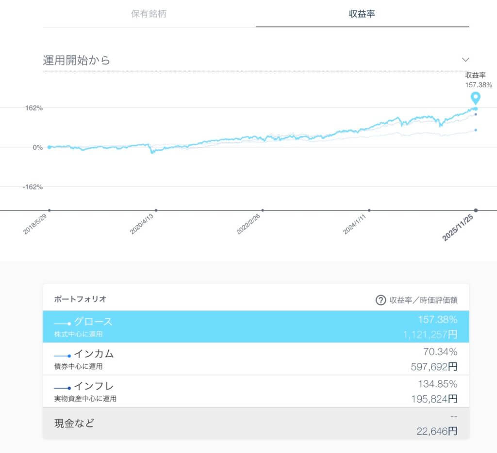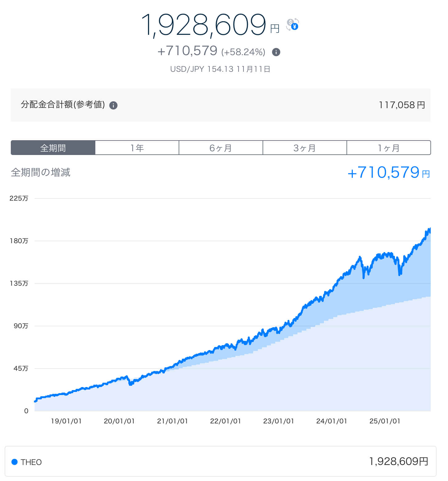 10万円からコツコツ積み立てを開始したロボアド「THEO(テオ)」の最新運用状況を共有します。2025年11月25日時点での時価評価額・ポートフォリオ内訳・資産推移・運用報酬などをまとめました。