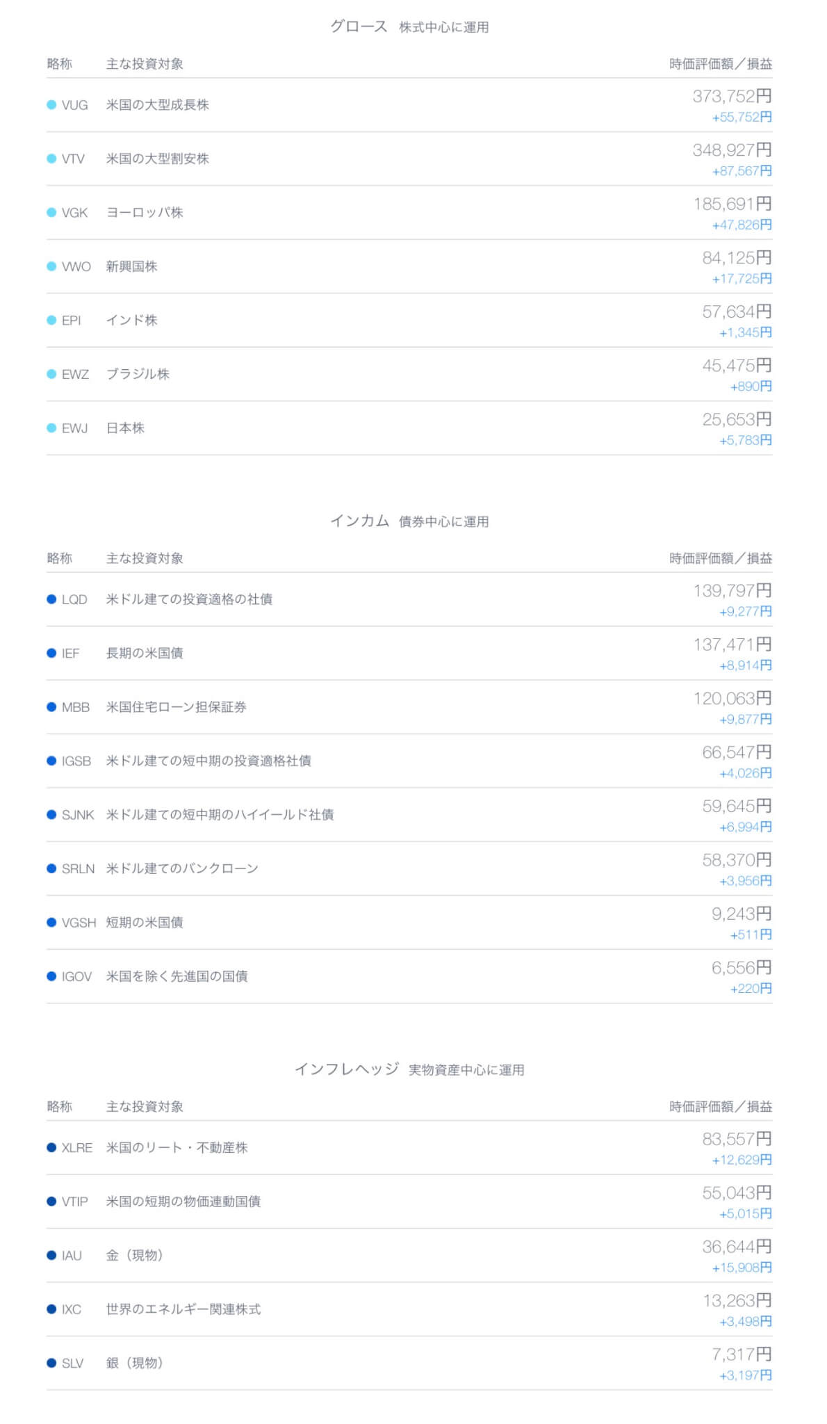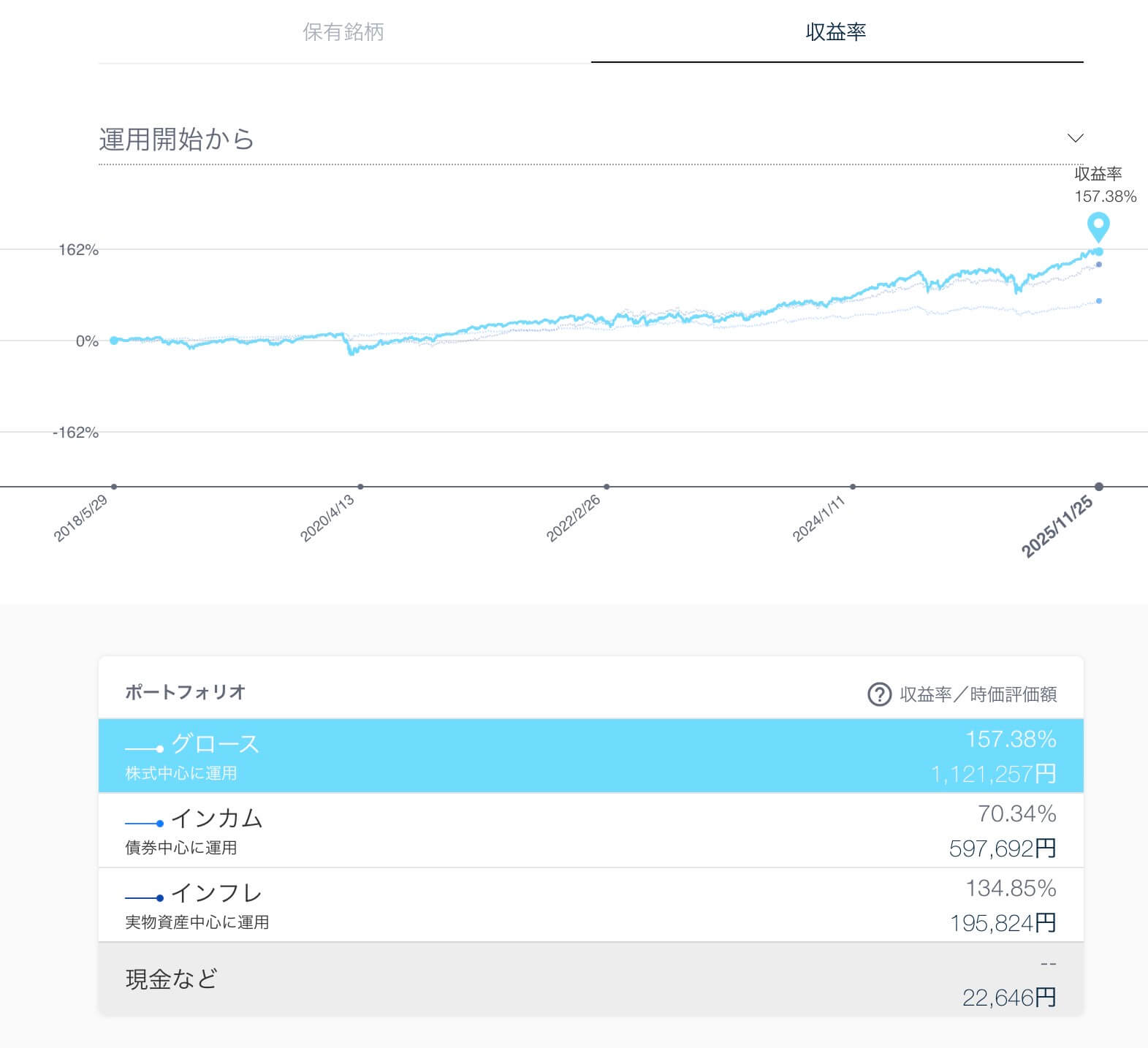 特に今年はグロース株が絶好調で、ドル建てでも円建てでも安定して資産が伸びました。インカム・インフレヘッジともにバランス良く育っており、「分散投資」の効果を体感できた1年でした。
