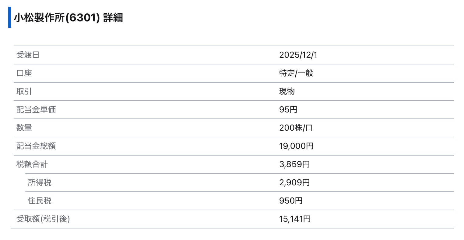 コマツから中間配当95円×200株=19,000円(税引後15,141円)を受け取り。次回以降は300株分の受け取りになる見込み。