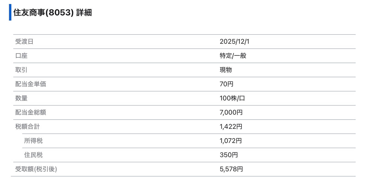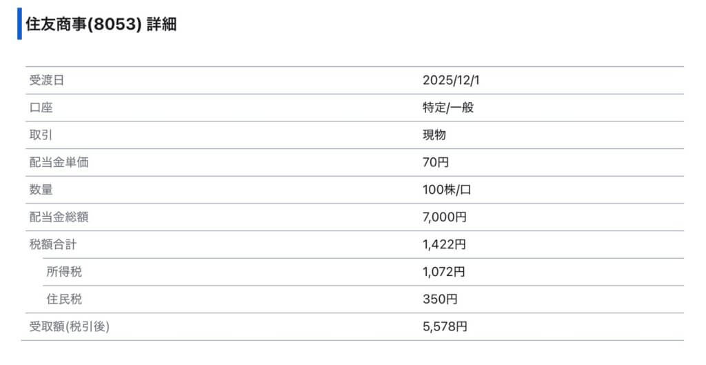 2025年12月1日に100株保有している住友商事から配当金いただきました。