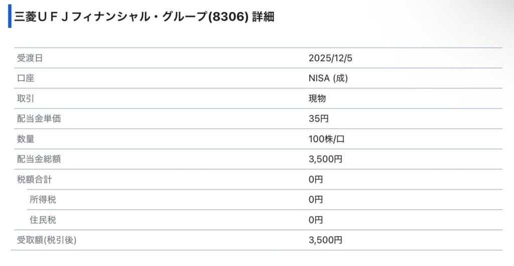 三菱UFJから 3,500円の中間配当(NISAで満額) を受取