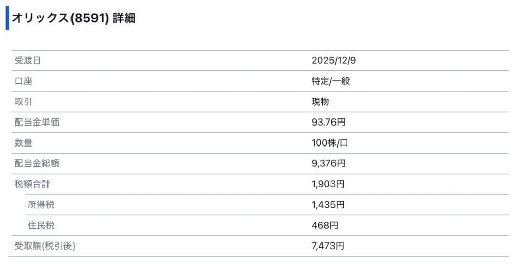 2025年12月9日、オリックスから1株93.76円の中間配当を受け取り、特定口座100株分で税引後7,473円の入金。
