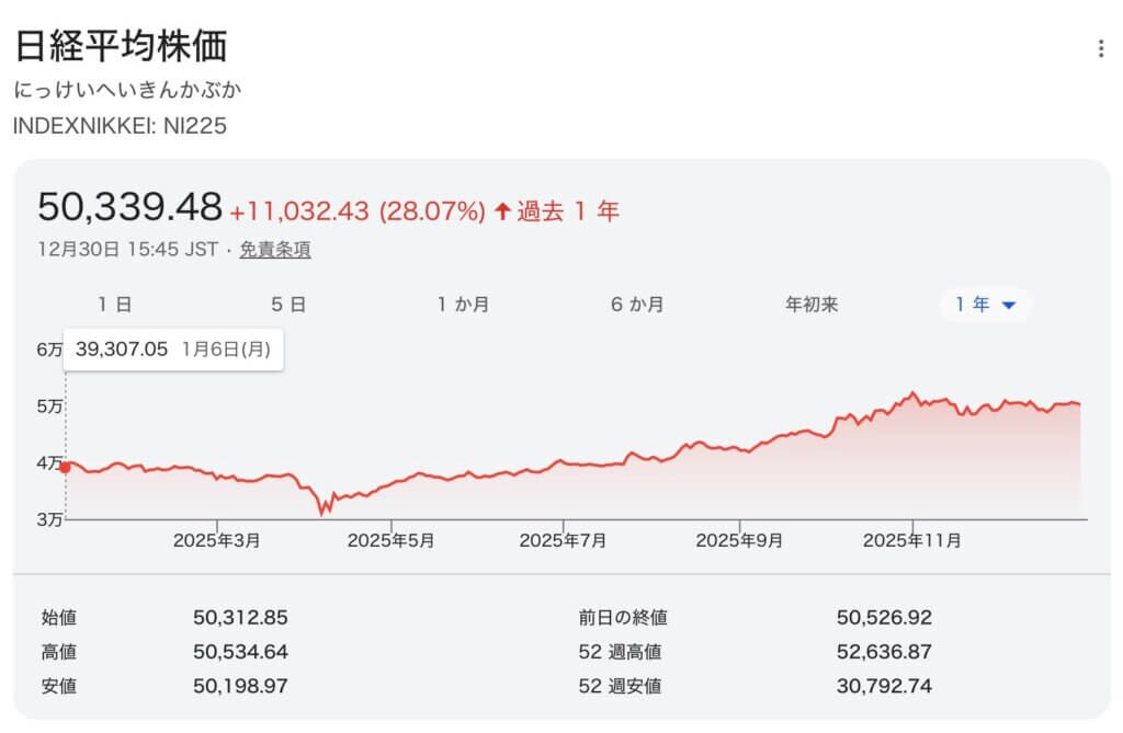 2025年は日経平均が50,000円台を突破し、過去最高水準で年末の取引を迎えた年でした。世界株高や内需回復、企業業績の底堅さが寄与し、東京株式市場は強い上昇トレンドを描きました。
