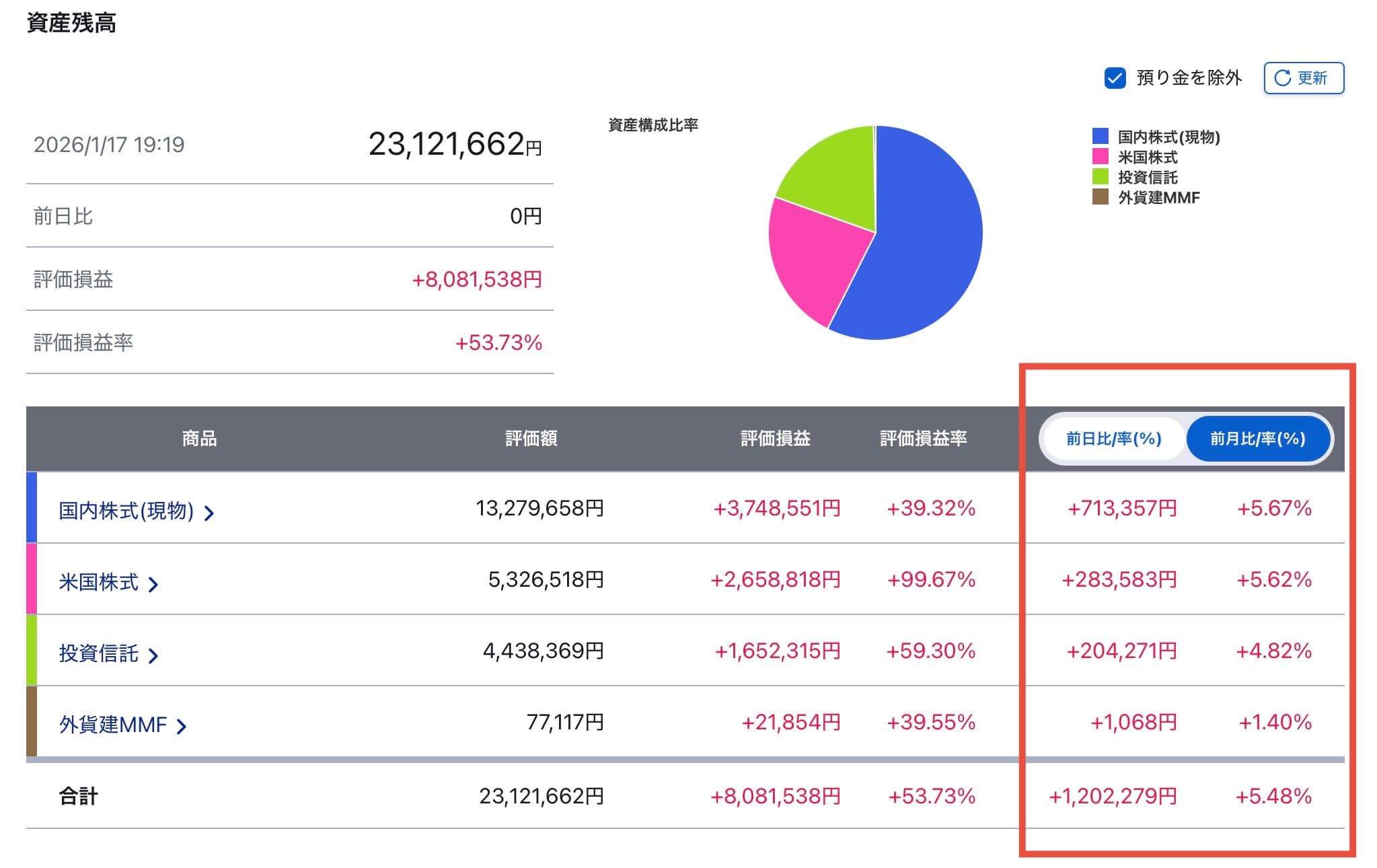 2026年1月17日時点で、筆者の株式ポートフォリオは前月比で約+5%超と、年初から好調なスタートを切っている。